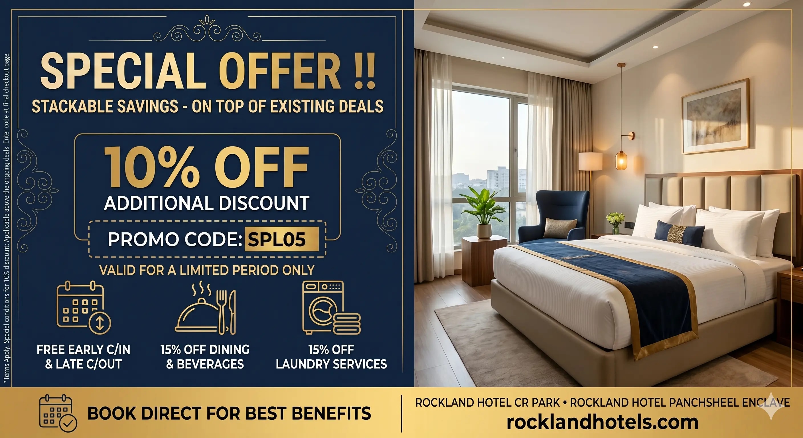 At Rockland Hotels, we believe luxury should be accessible. For a limited time, enjoy an extra 10% discount that applies even on top of our existing website deals.